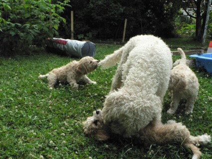kauen. Leya ist sehr instinktsicher und würgt ihr Futter für die Welpen hoch.